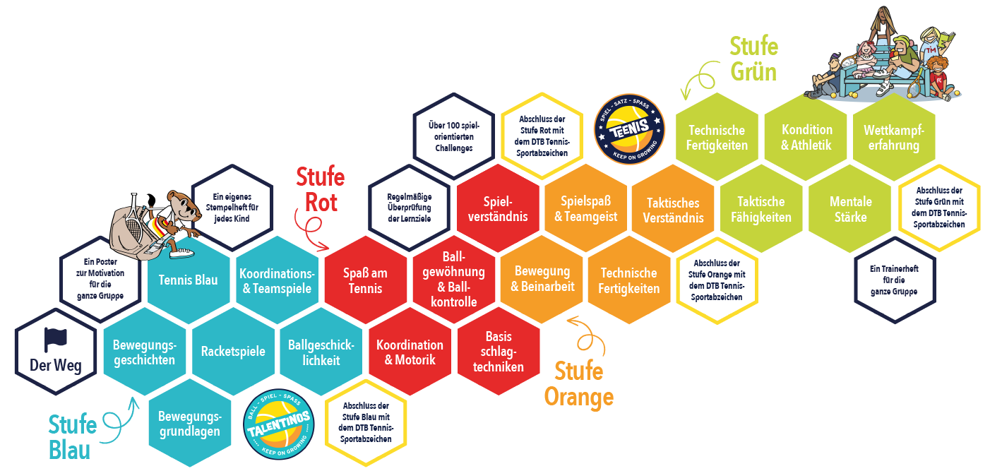 - Für den Abschluss einer Stufe und somit den Übergang in die nächste Stufe empfehlen wir das jeweilige DTB Tennis-Sportabzeichen in der Gruppe umzusetzen.